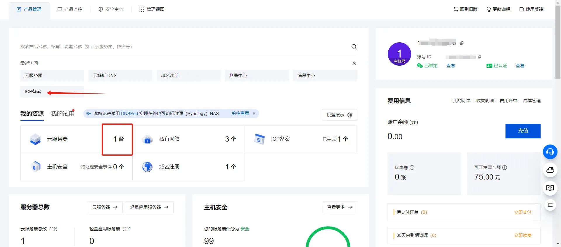 在控制台的我的资源,看到我们已经有一台服务器了(这是进行ICP备案必要的,必须要有一台云服务器),随后点击ICP备案。